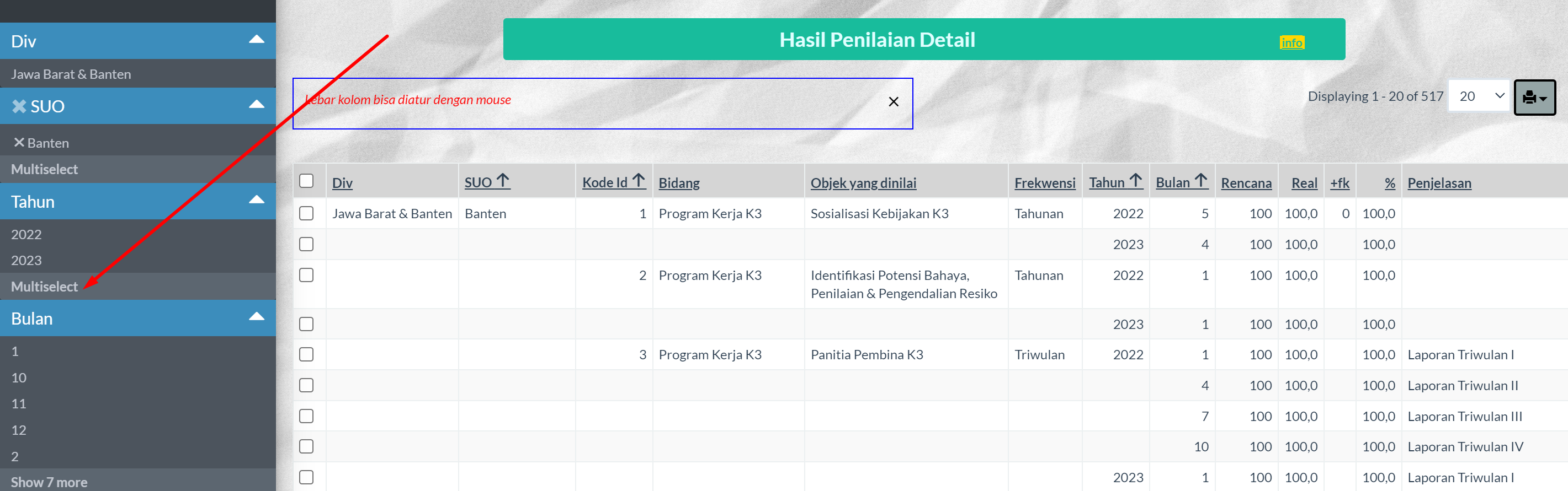 Dan bisa pula memilih realisasi hasil penilaian di beberapa nilai tertentu, caranya dengan mengklik tombol Multiselect, kemudian pilih nilainya, kemudian pilih Apply.