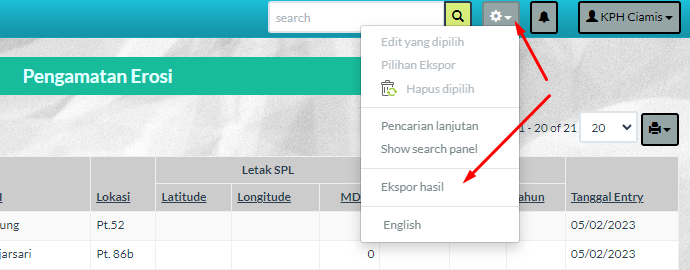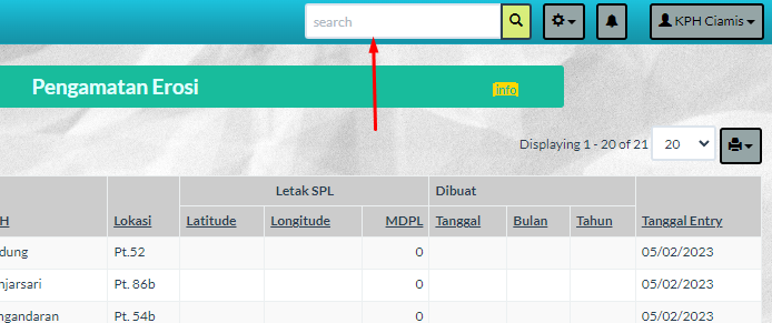 Untuk melakukan pencarian data dapat dilakukan dengan mengklik dan menuliskan data yang akan dicari pada tombol search yang berada di pojok kanan atas seperti berikut:
