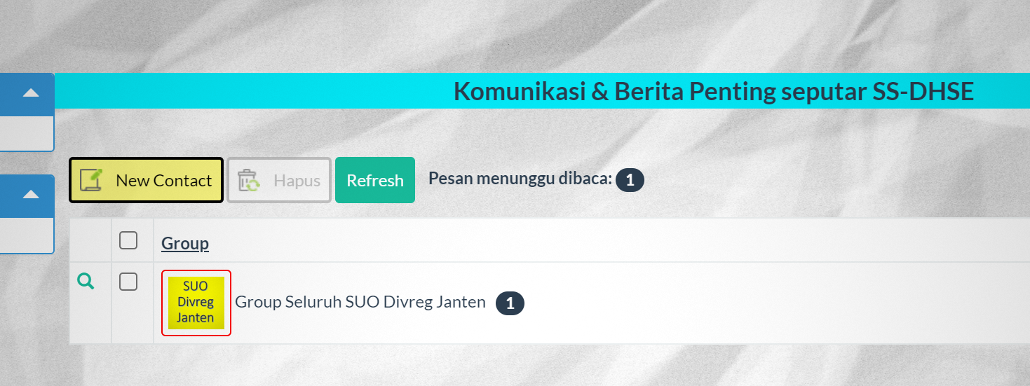 Untuk menyampaikan berita atau komunikasi dengan para pengguna lainnya selain dengan menggunakan What's App atau media sosial lainnya, disediakan pula fasilitas "Pesan/Message" pada SS-DHSE. Pesan bisa secara langsung ke user lain atau bisa pula dibuat group.