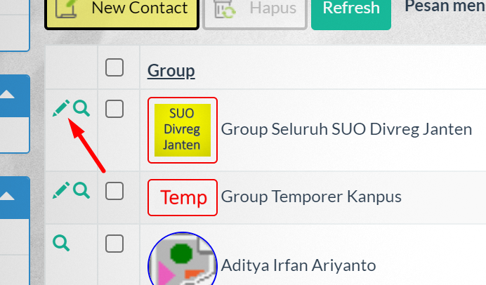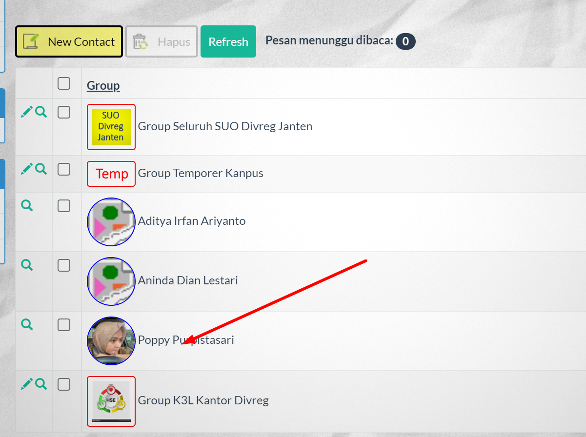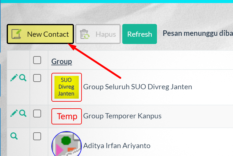 Untuk kembali ke daftar kontak klik tombol "Kontak"