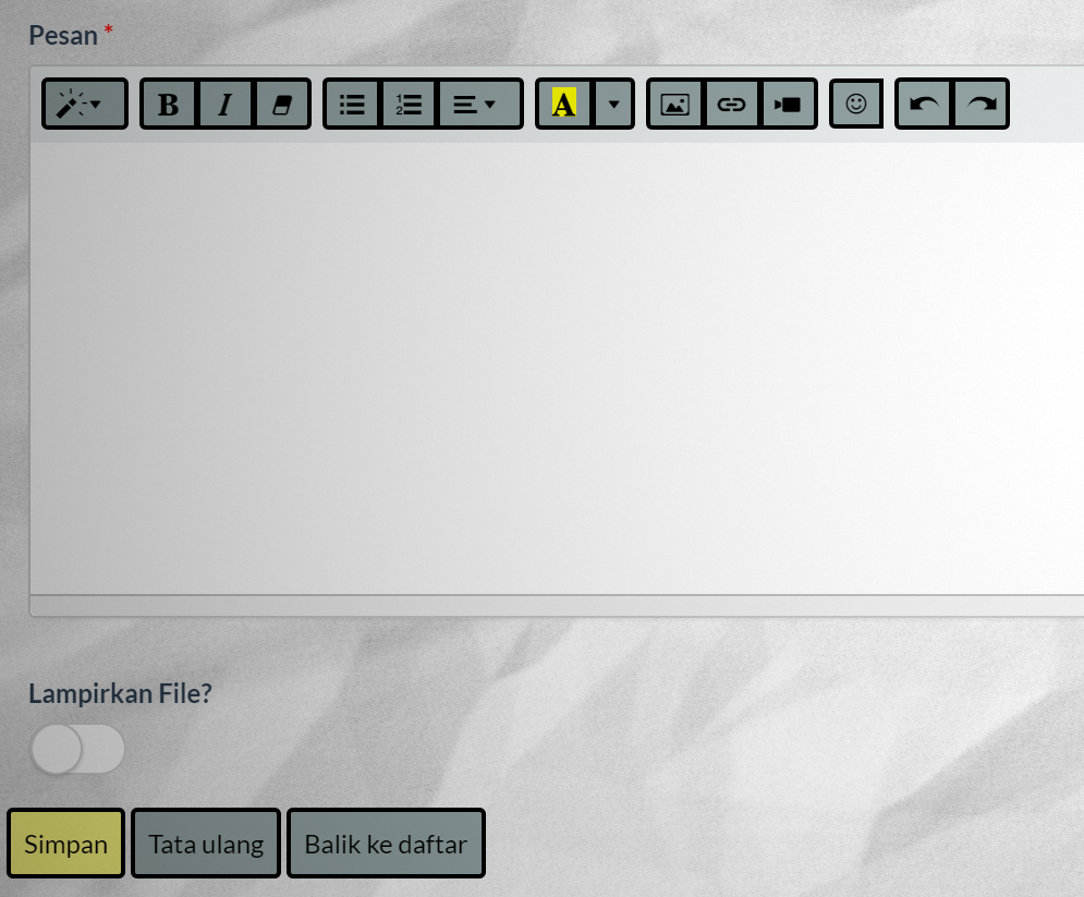 Dan akan terbuka kotak pesan, yang dapat diberi format teks, gambar atau media lainnya, termasuk melampirkan file tertentu bila dibutuhkan.