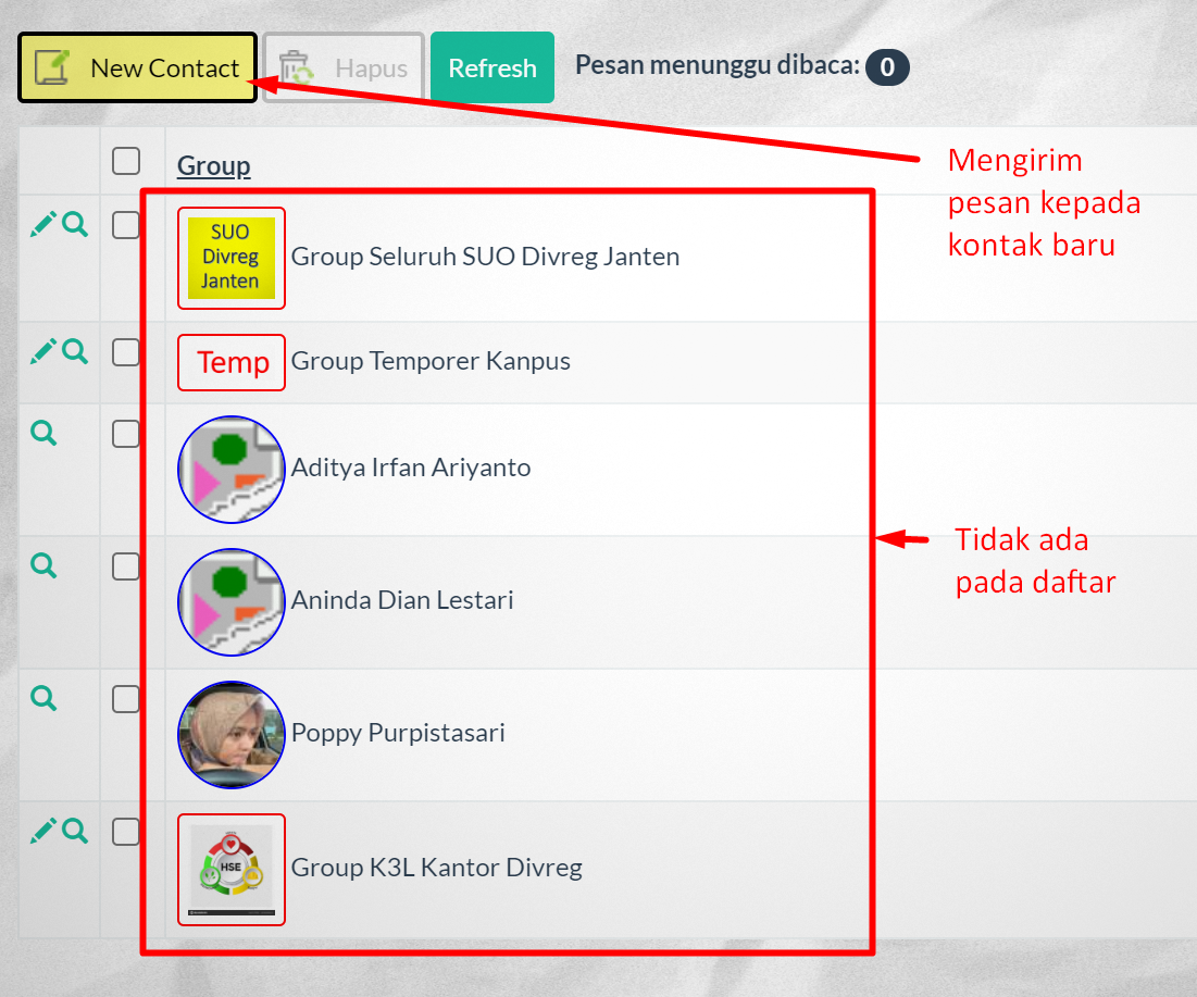 Untuk mengirim pesan ke kontak yang baru (belum tersedia di daftar yang ada), maka klik tombol New Contact