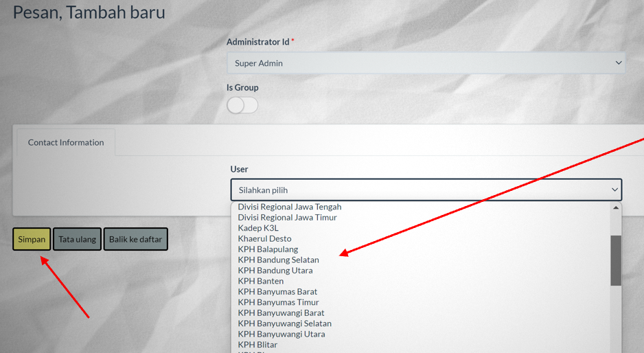 Kemudian akan terbuka form untuk memilih user baru, silahkan dipilih, misalnya KPH Bandung Selatan.