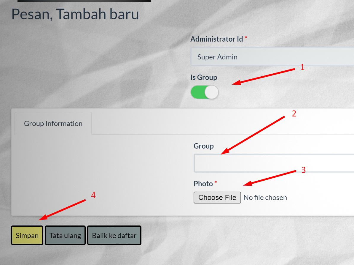 Lalu Geser tombol Is Group (1), Beri nama groupnya (2), Pilih icon/image (3) kemudian klik Simpan.