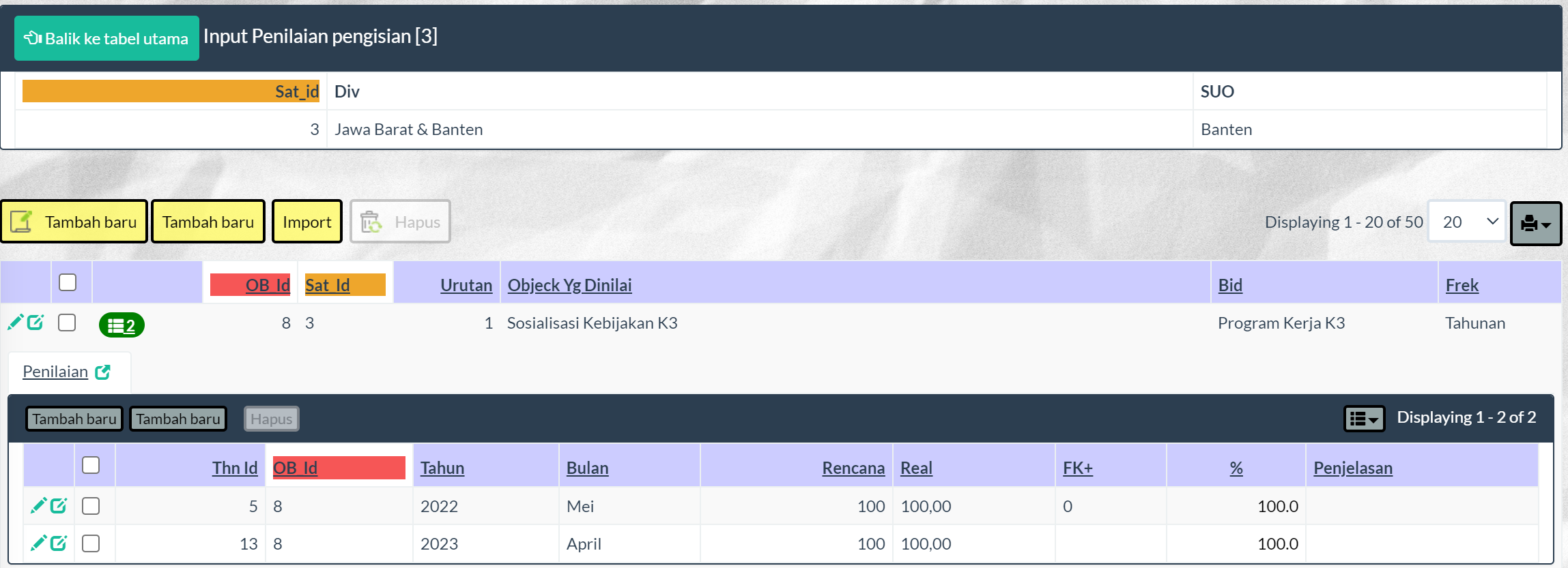Adapun yang dinilai yaitu pengisian terhadap seluruh table yang ada (50 table), pada tahun dan bulan tertentu.